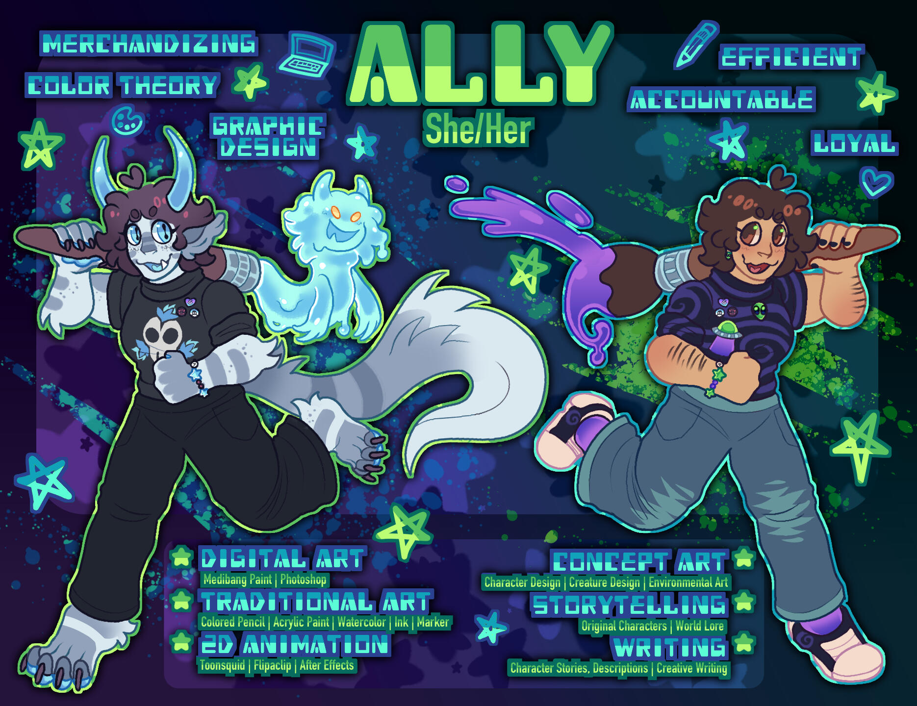 Hi! I’m Ally, or Ghost. I’m an 19 year old queer artist and student. My favorite things to draw are monsters, humanoids, and all things fantasy! I adore indie series and often use nature as my main inspiration for my designs.